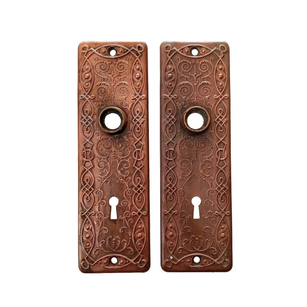 Decorative door plate in Branford's "Castilian" pattern. Wrought steel with nice copper finish. Cir. 1895. It features a dense geometric design with some ivy-like elements. The door plate measures 7 1/4"h x 2 1/4"w. The pattern was continued for a short time upon Yale's purchase of Branford. Some very small areas of finish loss, but very good overall color.