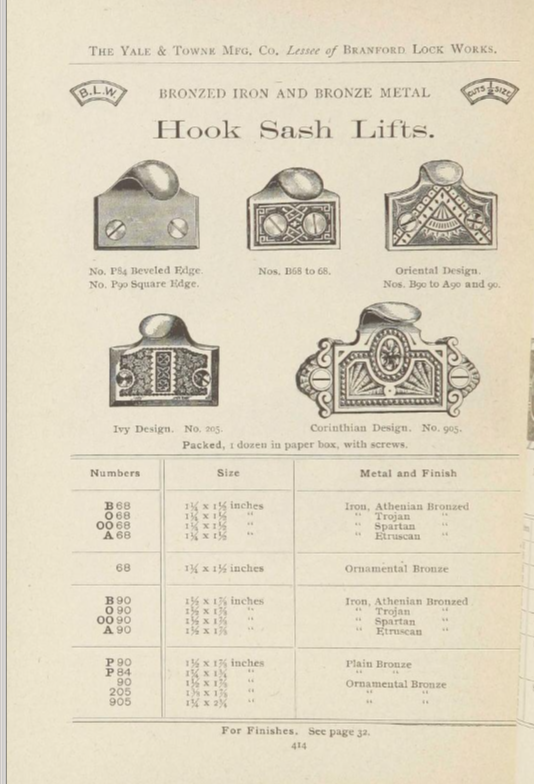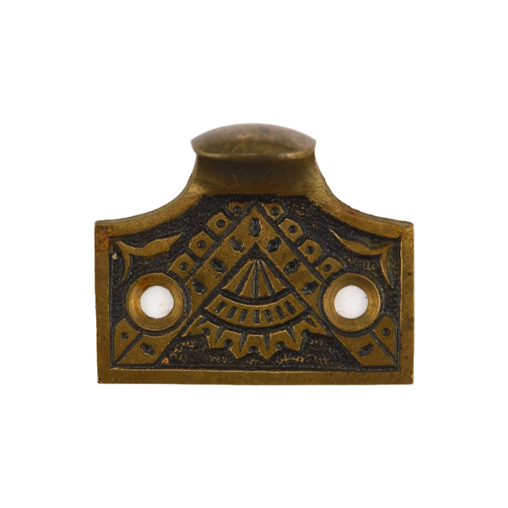 Decorative Eastlake style hook type window sash lift. "Oriental" design by Branford, cir. 1890s. This version is made of cast bronze. The background is japanned and mostly intact. The japanning brings out the design. The sash lift measures 1 7/8"w x 1 3/8"h along the back to the base of the hook. The lift is marked 90 on the back.
