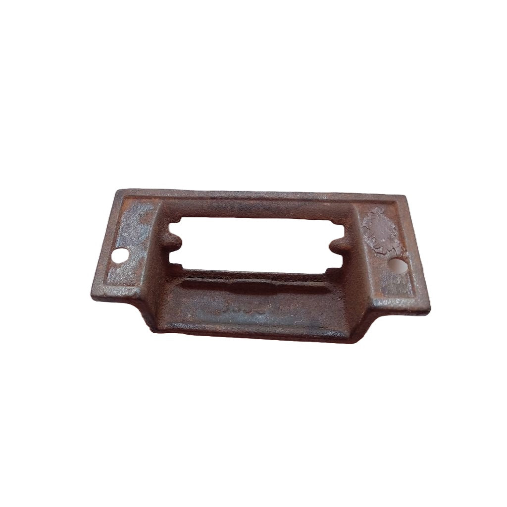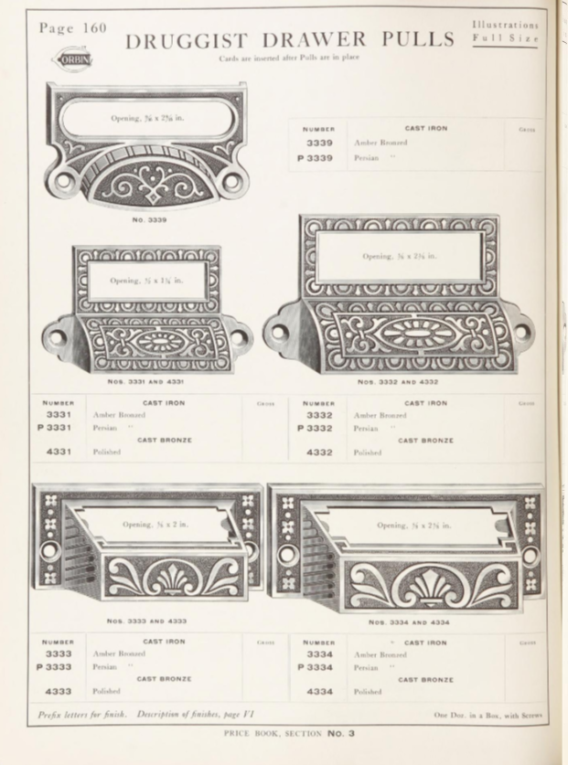 Decorative cast iron bin pull with attached label slot made by Corbin. This matches the 1895 bin pull but the druggist pull is only seen in the 1905 catalogue. Eastlake style decoration with geometric and floral/leaf motifs. The bin pull measures 3 1/4"l x 1 1/2"h. It has a 2 3/4" center to center distance for mounting screws. The back is marked 3833 4333(?).