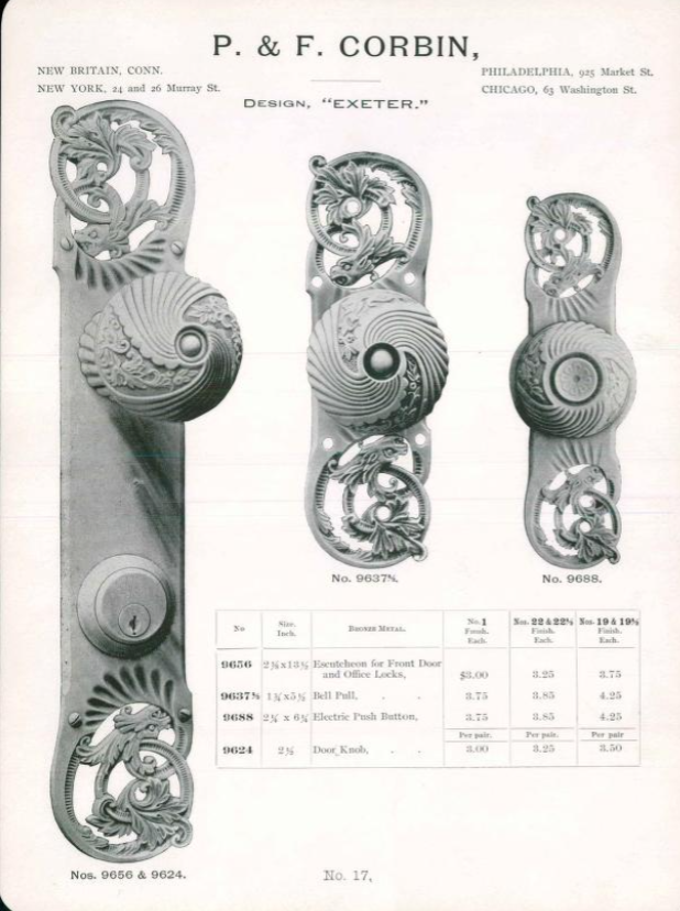 P&F Corbin was founded by brothers Philip and Frank Corbin in New Britain, CT. in 1851. Interestingly, Philip previously worked for the company that would become Russell and Erwin, which Corbin would merge with in 1902. It ran with a number of subsidiary companies in the 1900's including Corbin Cabinet Lock Co., Corbin Screw Company and even a Corbin Motor Vehicle Corporation! Corbin is still in business today under ownership of Assa Abloy under the name Corbin Russwin.