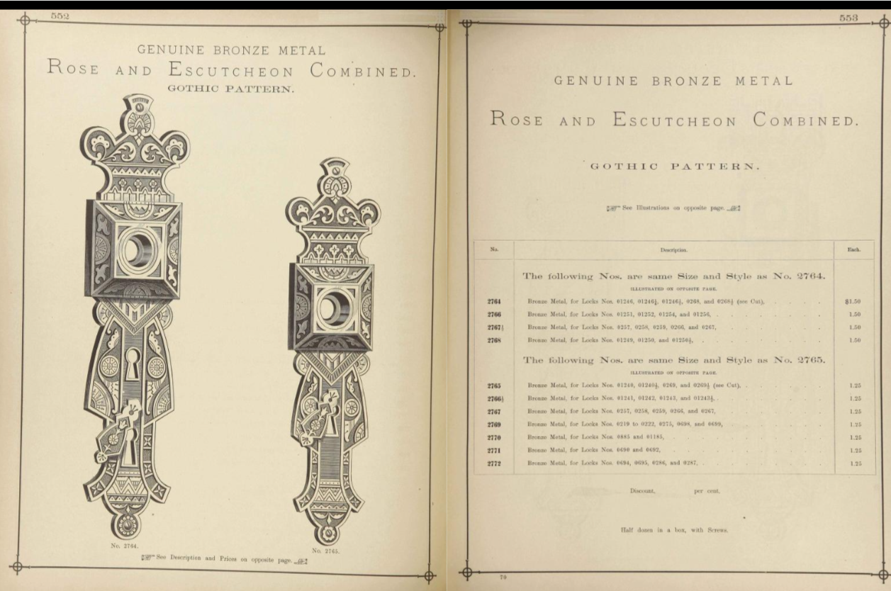 Cast bronze decorative door plate made by Corbin. Gothic design. Cir. 1881-1985. Highly decorated and shaped with geometric and floral design elements in Eastlake style. The door plate measures 8"l x 2"w. The back is stamped 2765 2767. There is some wear due to age. The patina is somewhat variable over the surface, but would polish up nicely if desired.