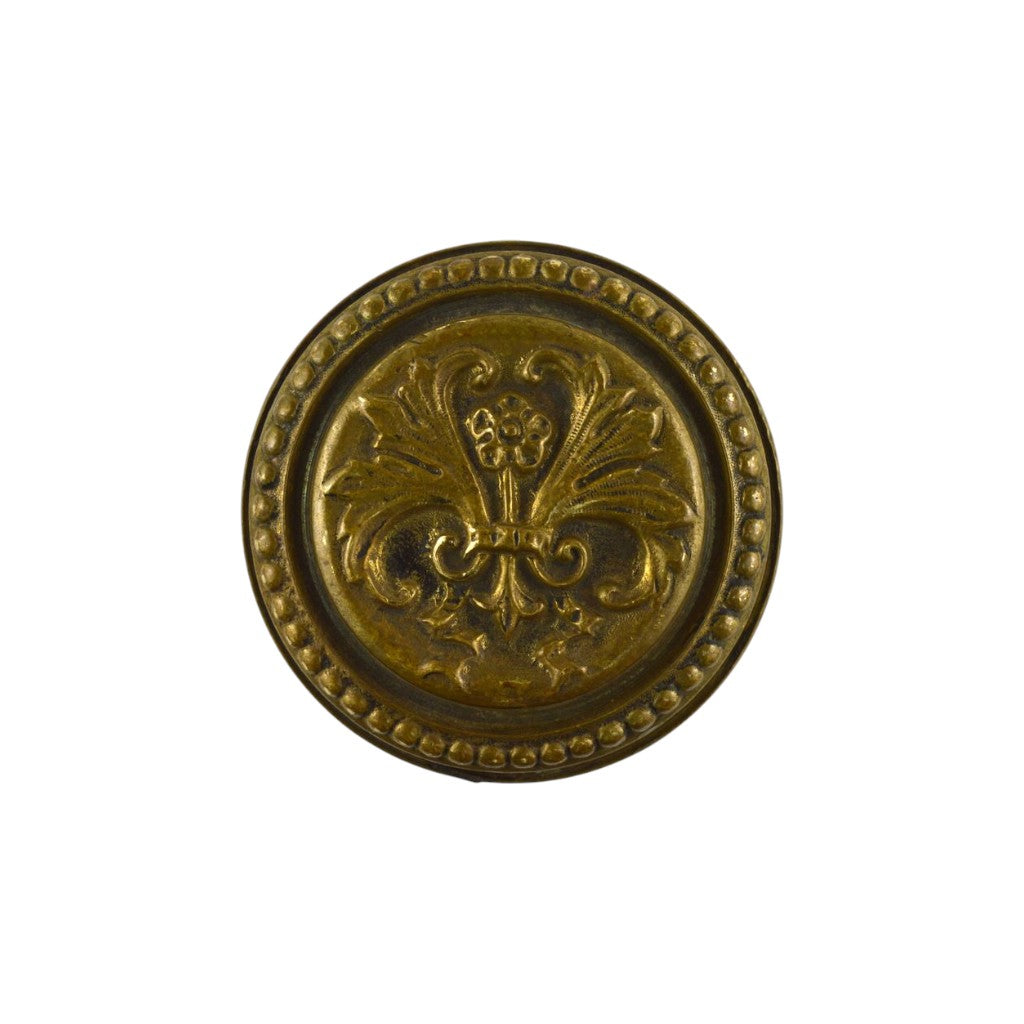 Decorative cast bronze doorknob made by Corbin. Tivoli design. Cir 1895-1905. The doorknob measures 2 1/4" diam. It features a bead border and twofold floral bouquet design in the middle. The shaping is a bit unique, thinner than a typical knob, but not quite drum shaped. It is in very good condition with a medium patina. This doorknob takes a standard sized square non-threaded shaft.