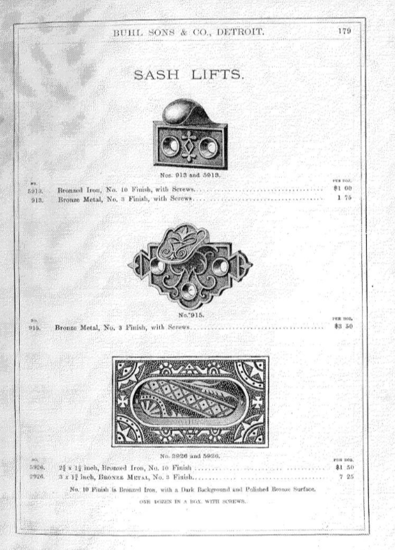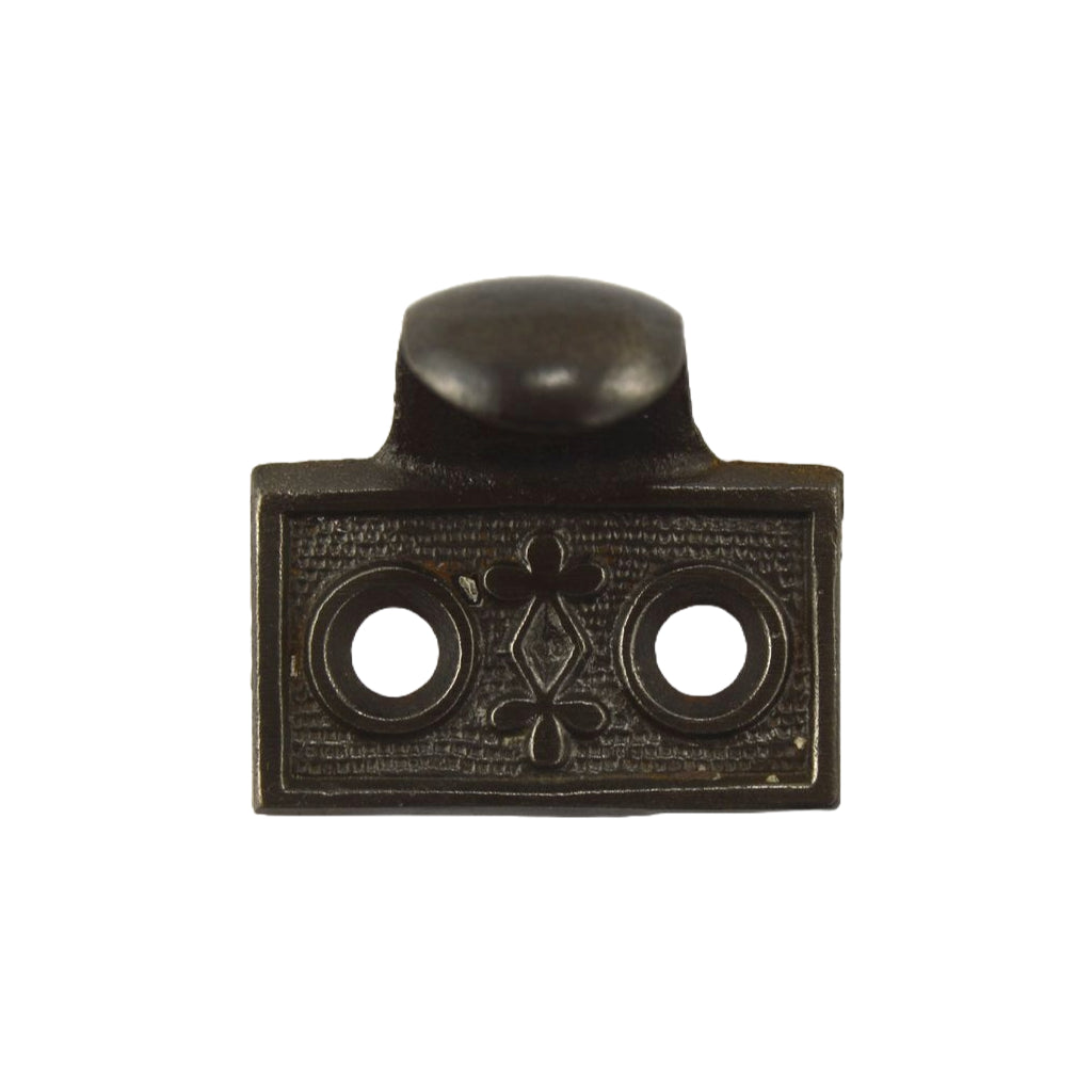 Decorative cast iron hook type window sash lift. I can't find this design in any of the usual suspect catalogues, so not sure who made this one. Seen in the Buhl & Sons 1884 catalogue, so possibly Parker & Whipple. Eastlake type design with a decorative element in the middle and a textured background. The plate area measures 1 1/2"l x 1"h. No Manufacturers markings.