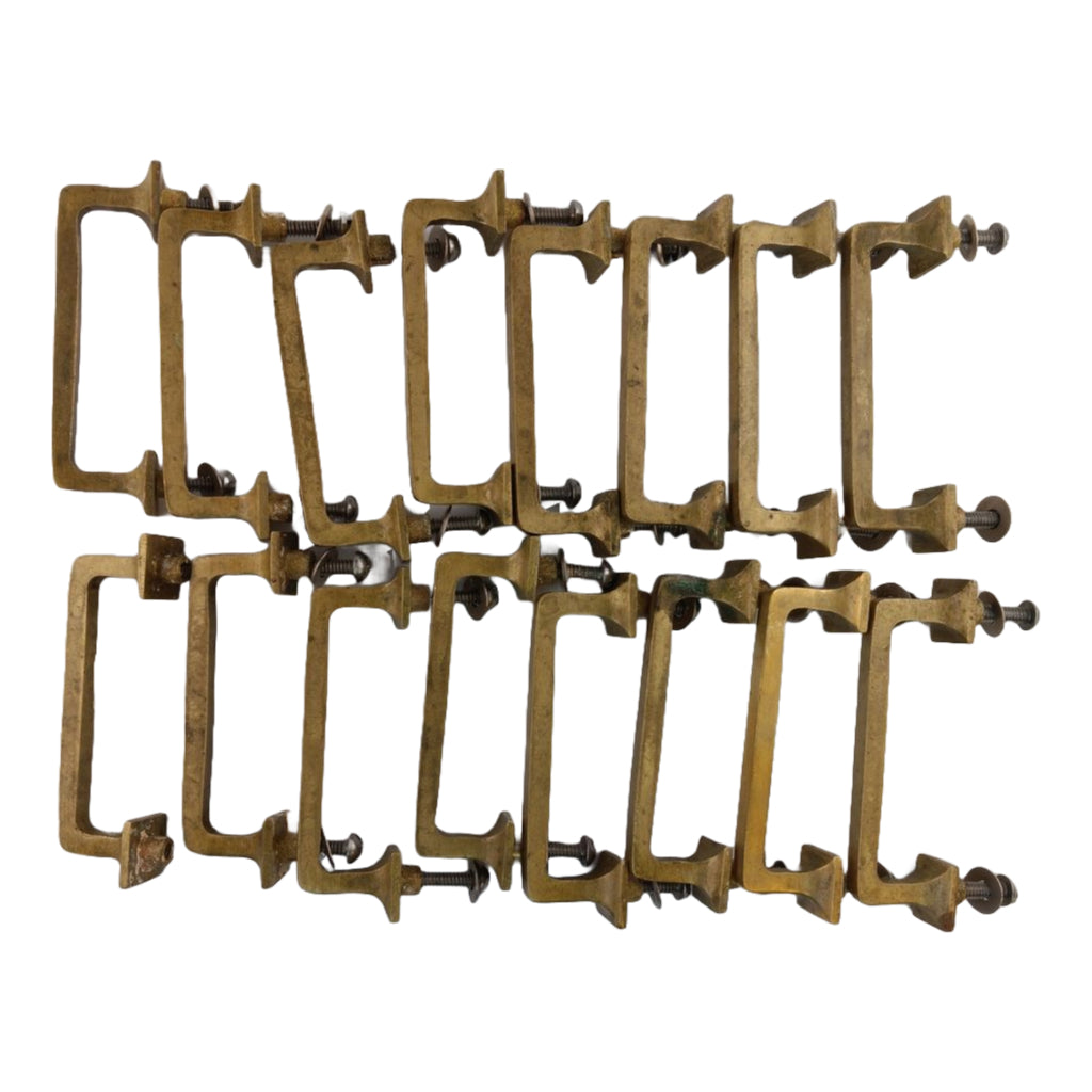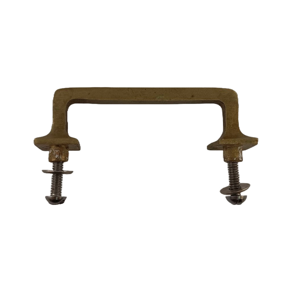 Solid brass handle with a simple design with squared ends. It is heavy with an industrial feel. The handle measures 3 3/4"l x 3/4"w. It has a 3" center to center distance for mounting screws.