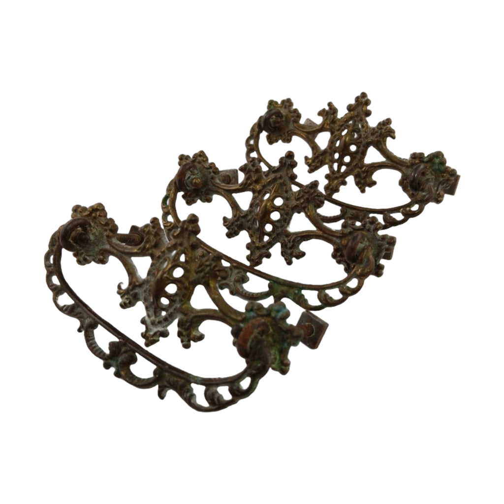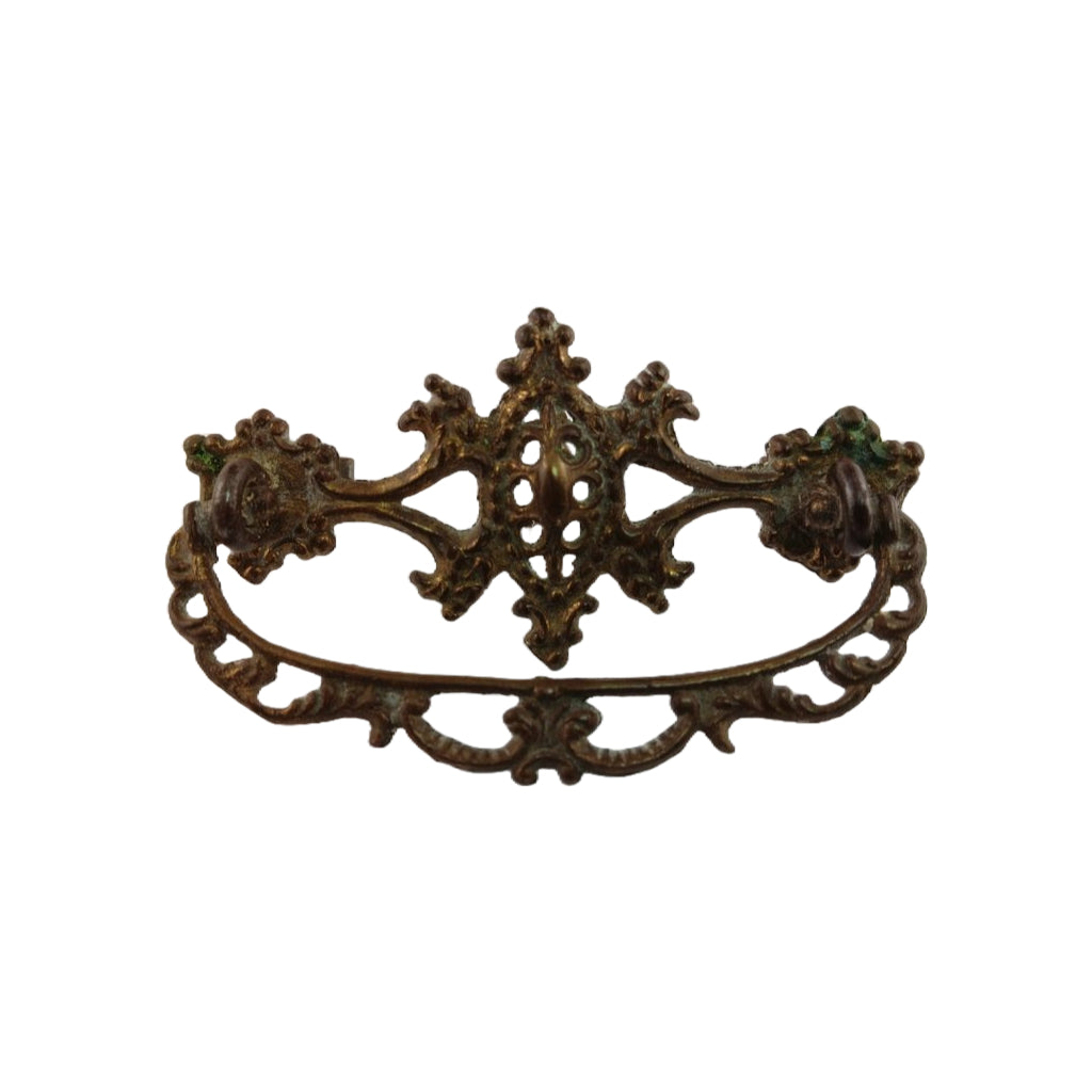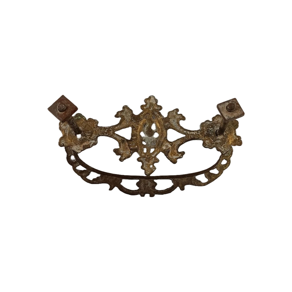 Victorian era cast brass decorative handle with bail made by Keeler Brass Company. The bail is a separate piece attached into affixed screws. The bail is decorative also. It is marked on the back KBC C63. The handle measures 4"l x 2 1/4"h. It has a 3" center to center distance for affixed mounting screws. The screws have a nut for securing in place.