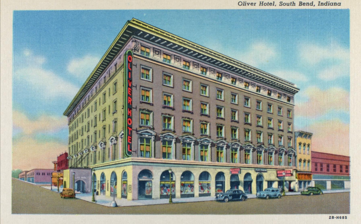 The hotel opened in December 1899 and was sponsored by James and J.D. Oliver to offer a high class hotel option in the city for their business associates.. It was built as a luxury hotel and could hold up to 40,000 people. It was located at the corner of Main and Washington streets and rose six stories high. The hotel was designed by Shepley, Rutan & Coolidge in a Renaissance style. Part of the luxury offerings were custom furnishings and an on-site Turkish bath. The hotel closed in 1967 and was later demolished. A modern office building known as Chase Tower now stands at the location.