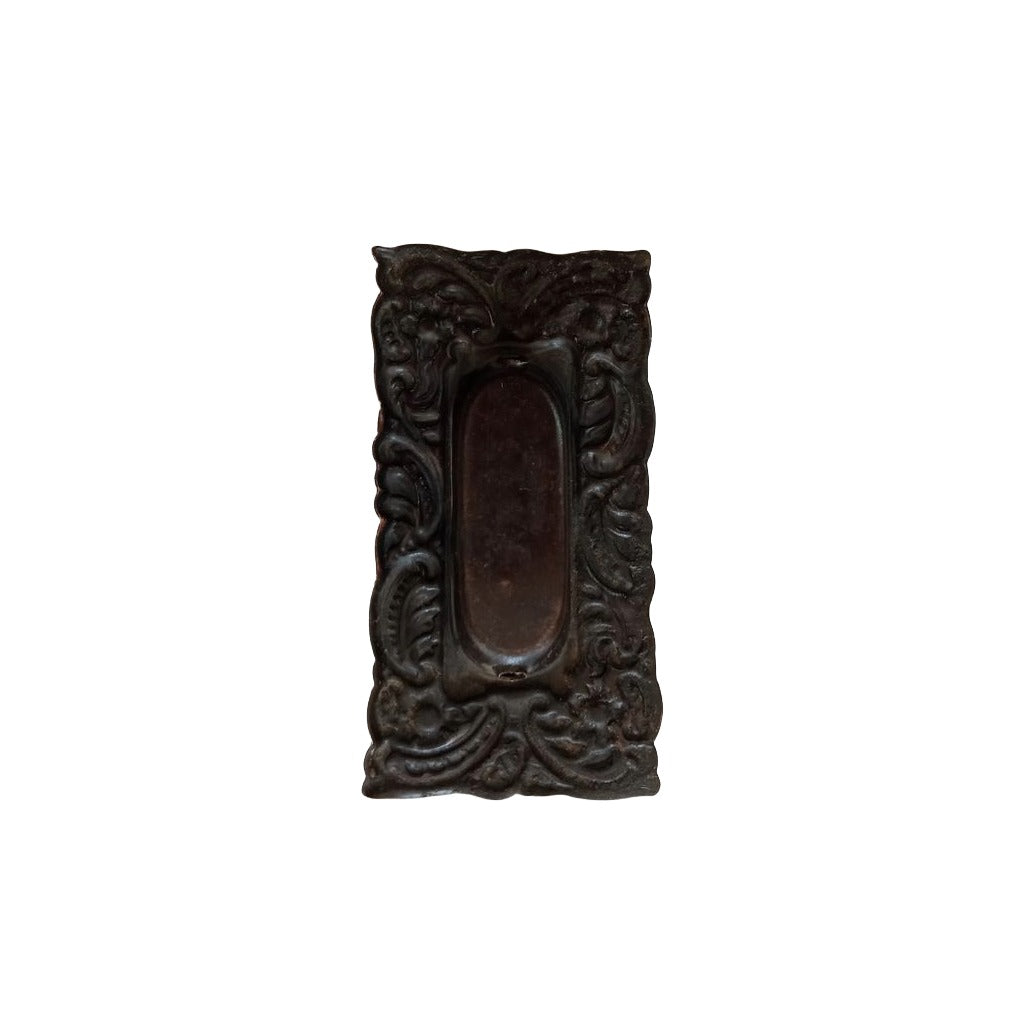 Decorative flush sash lift plate made by Reading. Cir. 1897-1899. It is made of wrought bronze. It features leaf and floral motifs along the outside edge. The lift measures 4"l x 2"w. The recessed area that would need to be cut out measures 2 1/4"l x 7/8"w. It has two holes on the inside of the recessed area for attachment.