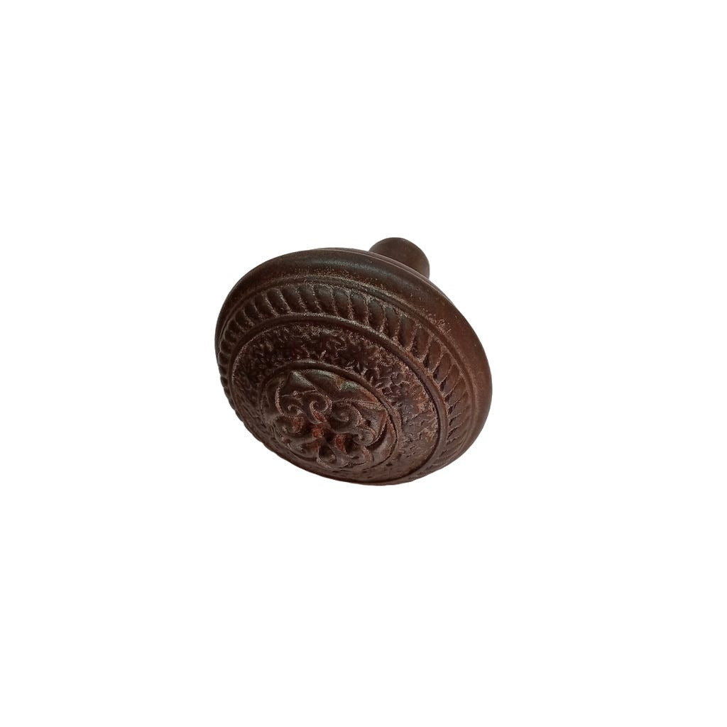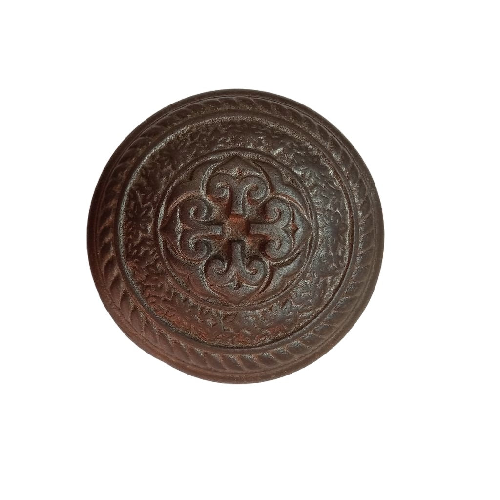 Cast iron doorknob made by Taylor and Boggis in "Cuyahoga" design. Cir. 1910. Doorknobs measure 2 1/4" in diameter. It has a fourfold design in the center with concentric decorative borders. Slight wear and rust pitting.